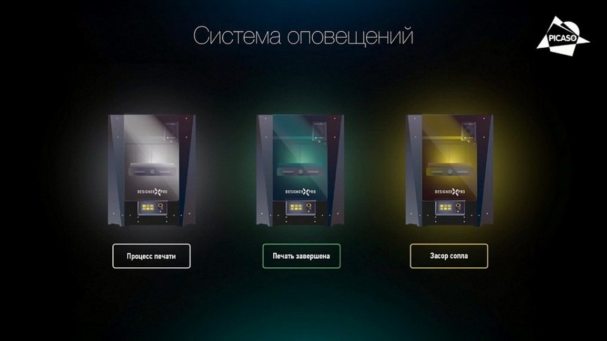 Принтер имеет встроенные системы контроля, определяющие неполадки с подачей филамента в экструдер. Если обнаруживается засор сопла, принтер автоматически пытается прочистить сопло и в случае успеха продолжает печать с места остановки, в случае неудачи печать стопорится, и пользователю отправляется оповещение. Благодаря такой системе материал не тратится впустую.