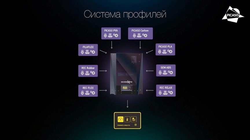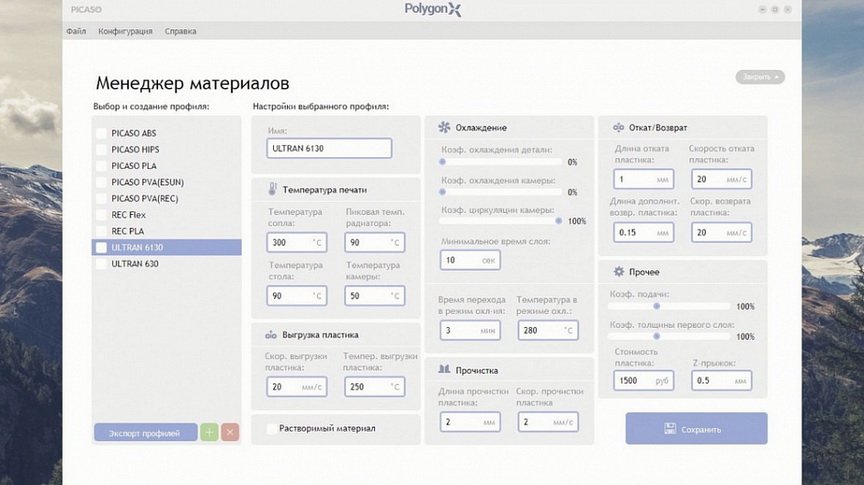 Перед началом работы в Polygon X пользователь создает отдельный профиль материала, где отмечает все необходимые для печати настройки. Профиль сохраняется в менеджере, и перед непосредсвенной печатью требуется только построить геометрию и выбрать материал, все прочие настройки принтер совершит самостоятельно на основе сохраненного профиля. При переключении на новый материал пользователю не придется самому менять многочисленные настройки принтера, достаточно выбрать в менеджере нужный профиль материала.