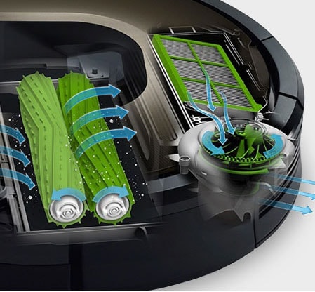 Roomba 980 использует двойные резиновые щётки-валики, которые впервые появились в моделях 800-й Серии. Обеспечивают эффективную чистку от любого мусора, в том числе волос и шерсти животных.