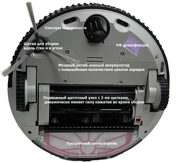 Модельный ряд 2018 года. PRO комплектация. 4 боковых щеток, 4 фильтра, 5 протирок для моющей панели, комплект подшипников для основных щеток. Плавающая головка щеток - эффективно собирает любые типы мусора. Пульт радиоуправления с дисплеем. Li-ion. Литионная батарея без выраженного эффекта памяти с повышенным сроком службы.
