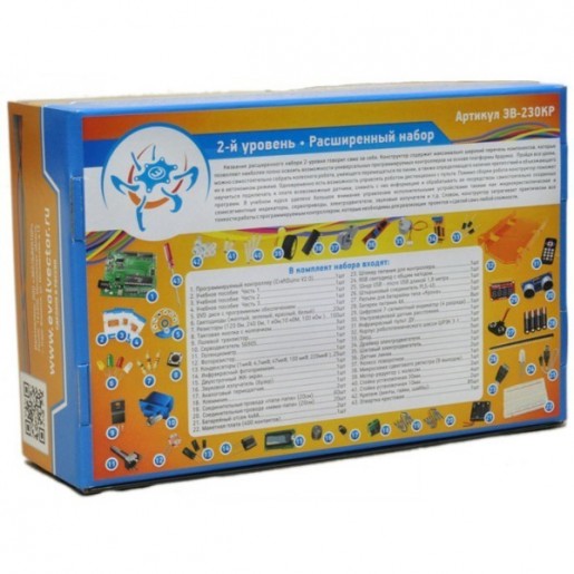 Расширенный набор 2-ого уровня Робот+ — это конструктор с беспрецедентно богатым набором деталей, электронных компонентов и устройств для максимально полного освоения возможностей программируемых контроллеров, созданных на основе платформы Ардуино. В формате увлекательных уроков рассматривается работа с отдельными электронными компонентами, микросхемами и такими интересными устройствами, как жидкокристаллический экран, цифровой индикатор, инфракрасный пульт управления, сервопривод, электродвигатель, различные датчики и многие другие элементы. А венчает учебный курс сборка настоящего колесного робота и обучение его выполнению различных задач, которые связаны с ориентированием и перемещением в пространстве.