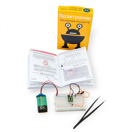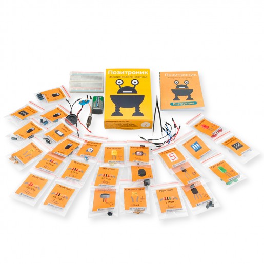 Основное назначение электронного набора «Позитроник»- это обучение азам электроники. В книге, прилагаемой к набору, дается представление об электрическом токе, принципиальных электрических схемах, резисторах, светодиодах, транзисторах и других электронных компонентах. Книга содержит справочный материал, таблицу цветовой маркировки резисторов, таблицу кодировки керамических конденсаторов.