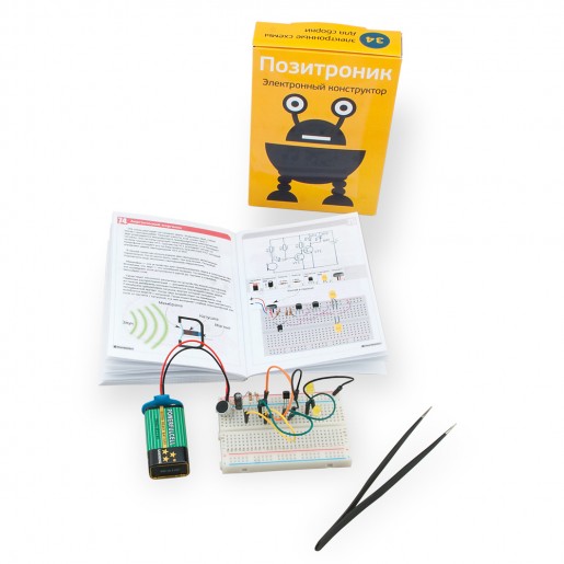 Набор «Позитроник» не требует пайки. Все конструкции собираются на макетной плате без пайки. Для питания всех устройств используется батарейка Крона напряжением 9 вольт, поэтому набор абсолютно безопасен. Но следует помнить, что в его состав входят мелкие детали!