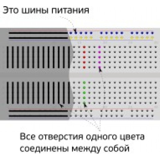 Макетная платаОснова для всех конструкций. Позволяет соединять компоненты в электрические цепи без пайки. Компоненты можно вставлять и вынимать сколько угодно раз.