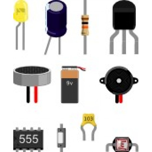 В набор входит 74 настоящих электронных компонента. Это микросхемы, резисторы, транзисторы, конденсаторы, различные датчики и соединительные провода.