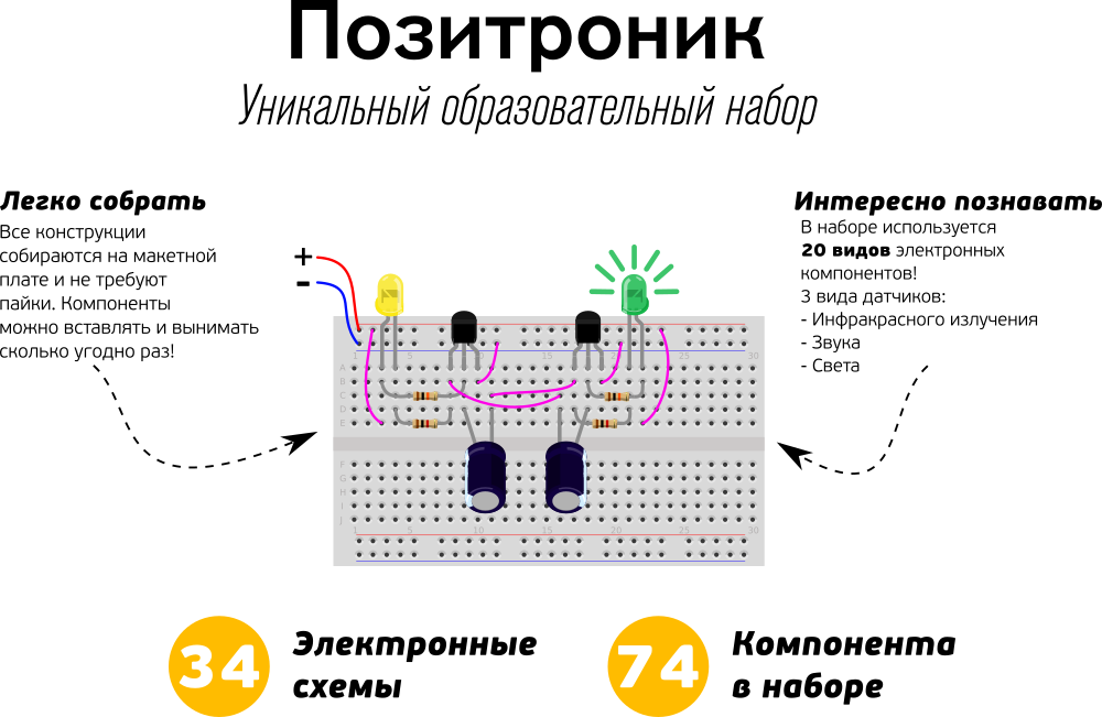 Электронный образовательный набор «Позитроник» предназначен для детей в возрасте от 8 лет, школьников, студентов и всех интересующихся электроникой. Для всех, кто хочет понять как работает современные электроника. «Позитроник» откроет дверь в увлекательный мир радиотехники.