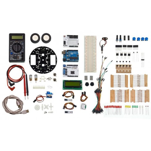 В практичной пластиковой коробке вы найдете всё необходимое для прохождения всех глав учебника: от базовых электронных компонентов вроде резисторов, светодиодов и транзисторов до моторов, сенсоров, LCD-экрана и мобильной платформы для построения роботов.